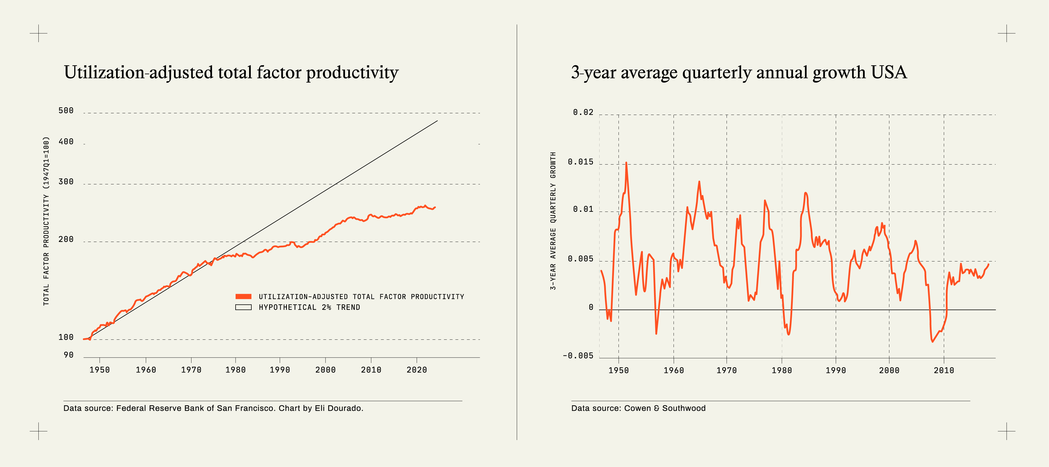 Key economic metrics such as GDP and total factor productivity have been slowing down for decades. Even though computing technology is still racing ahead, other fields are lagging behind. Manufacturing, construction, transportation, and energy have seen no new general-purpose technologies since the 1960s—contrast with the period 1880–1940, which saw the invention of electrical power, synthetic plastics, the assembly line, the automobile and the airplane. Nuclear power was once on track to be the dominant source of world electricity;24 instead, it plateaued at about 10%.25 The Concorde was grounded, and the planes we fly today actually go a bit slower than the jets of the 1960s.26 The Apollo program was canceled; no human has left low-Earth orbit since 1972.27