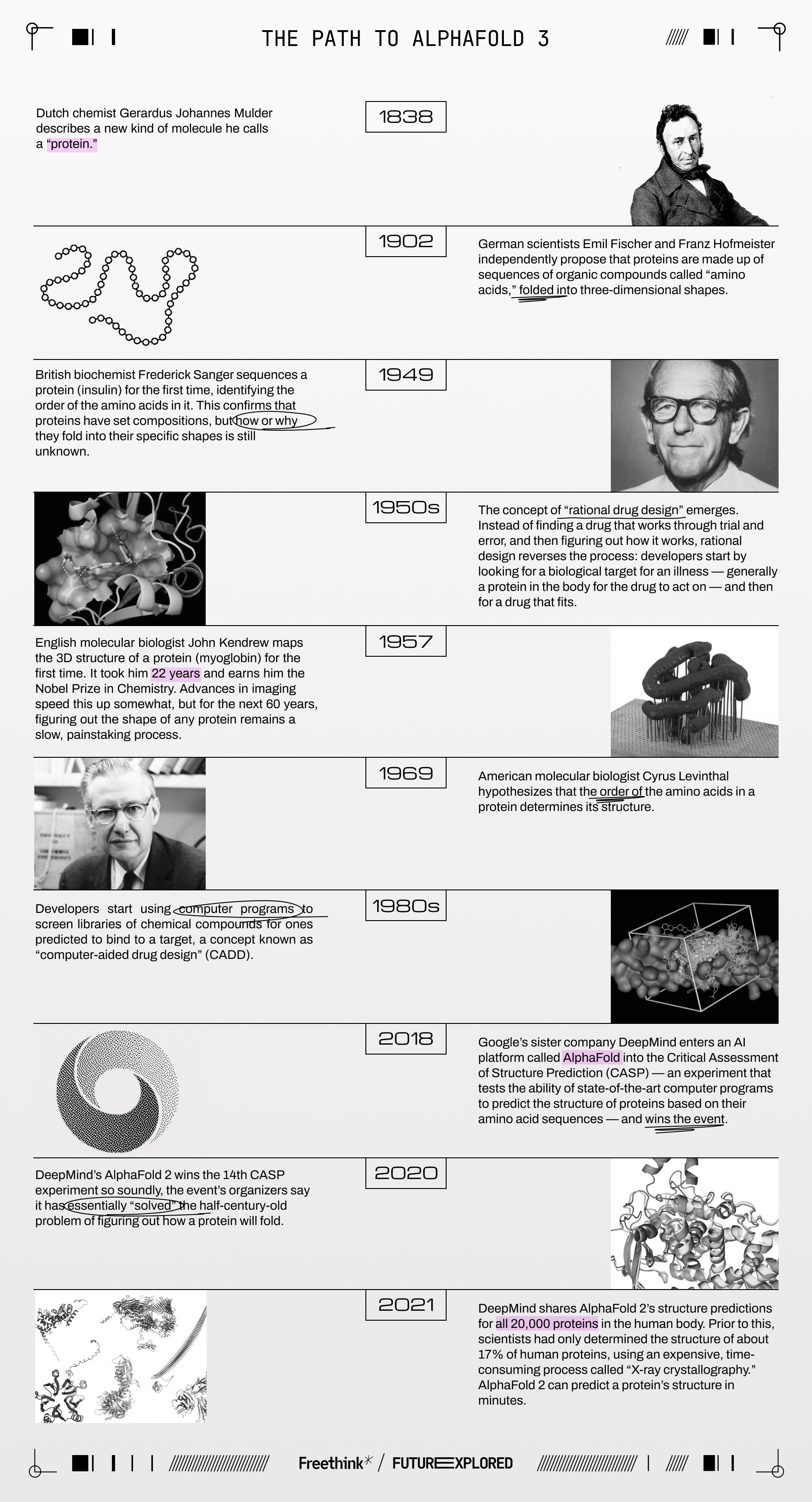 “Without AlphaFold, a chemist would have to rely more heavily on experimental crystallography or CryoEM to obtain a single structure, which can take months or even years, or use an existing structure with a different small molecule as a template for design, which would not capture the subtle but crucial changes in structure with different molecules,” Max Jaderberg, chief AI officer at Isomorphic Labs, a drug discovery company spun out of DeepMind in 2021, told Freethink.
